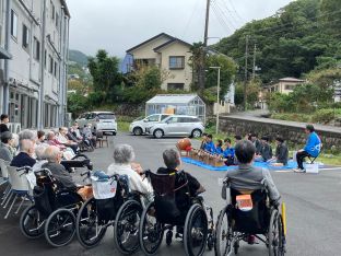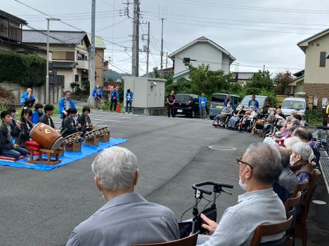 秋空の下、太鼓の音が敷地内に響き渡ります ご利用者の皆さまも外に出てその迫力ある演奏を楽しみました